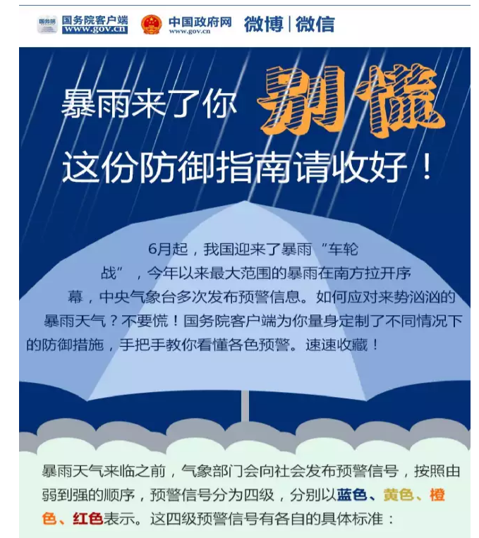6月起,我国迎来了暴雨“车轮战”,今年以来最大范围的降雨在南方拉开序幕,中央气象台多次发布预警信息。蓝色、黄色、橙色、红色各色预警怎么看?接到预警后要做什么?