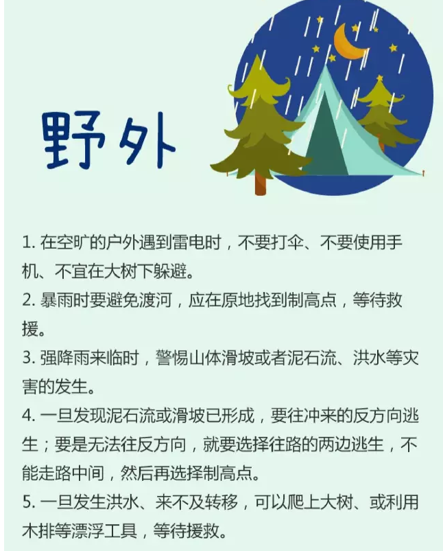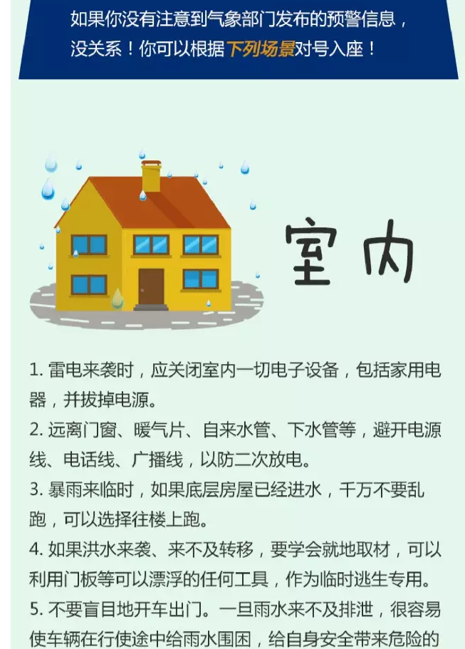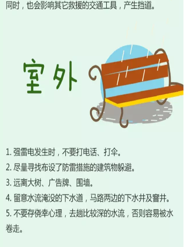 5.切勿游泳或从事其它水上运动,不宜进行室外球类运动。离开水面以及其它空旷场地,寻找地方躲避。
